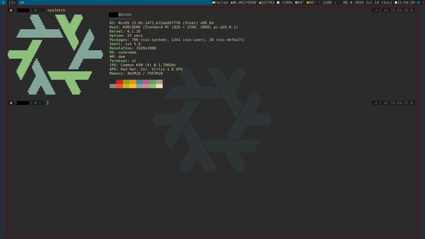 While I was able to get dwm working rather quickly, I spent a decent amount of time attempting to get dwmblocks to display correctly. Even when I did, I had a lot of trouble getting the bar’s objects to be clickable. I’m writing this article after the fact (and after having deleted my NixOS VM in favor of a fresh start), but I don’t recall ever getting the bar to work as it does on Arch and Debian.