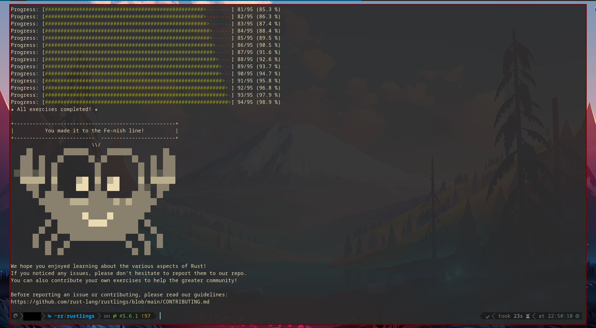 By the end of 2023 October, I was still in the process of choosing the “first programming language” that I would dedicate a solid amount of time to learn. After trying out Python and TypeScript for a time, and not really feeling like either was right for me, I went back to my Bash projects, working to improve my debian-dwm installer. But, even as I made more progress with Bash, I still felt that it would be good to start learning “a real programming language”. As I mentioned in a previous article, I “wanted a language that would punish my lack of understanding, and would force me to better appreciate what I was trying to tell the computer to do”. Put another way, I wanted a language that would make me use all the knowledge I had gained from thePrimeagen’s Data Structures and Algorithms course. I forget exactly how I stumbled upon it; but, by the end of 2023 October, I finally found a language that would give me all of that: Rust.