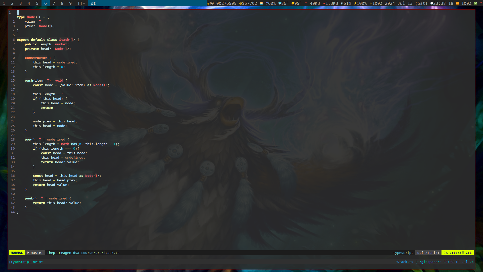 An image of some TypeScript code that was written as I worked through thePrimeagen’s DSA course. Specifically, this was an implementation of a data structure called a “stack”.